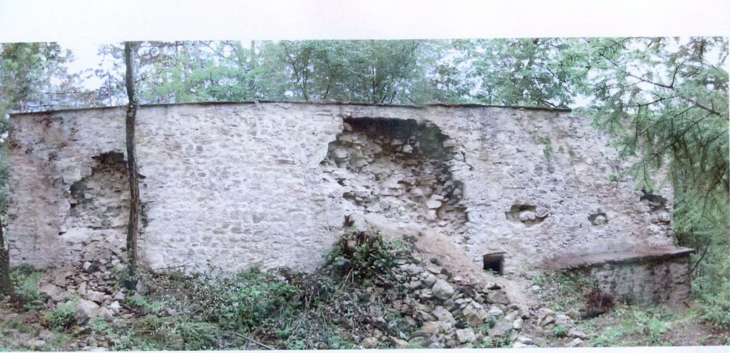 - Aus der mächtigen zweischaligen Mauer an der Nordwestseite waren bergseits zwei große Löcher heraus gebrochen. Die Steine und das Füllmaterial lagen meterhoch am Boden. An der Mauerkante war ein handbreiter Riss entstanden, so dass die Wand in absehbarer Zeit ins Tal zu stürzen drohte.